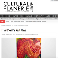 First, it’s the capture of light that draws your attention, refracted across the canvas like rippled water in a creek. Then it’s the way colour and movement wrestle in undulating lines, dragging and splitting pigment into writhing forms. Physical and full of life, Fran O’Neill’s paintings captivate from the minute you walk in the gallery door.