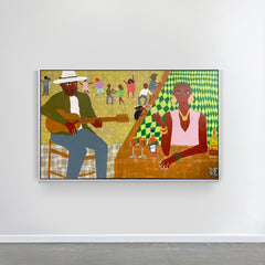 While living in Japan, Sally developed particular interest in Japanese Woodblock Prints and Wagara; the use of design and pattern in Japanese printmaking. The print and repetition of motif to create order, rhythm and structure are key compositional elements within Sally’s work. She weaves human narratives within these structural foundations, exploring scenes of everyday life and human interaction.